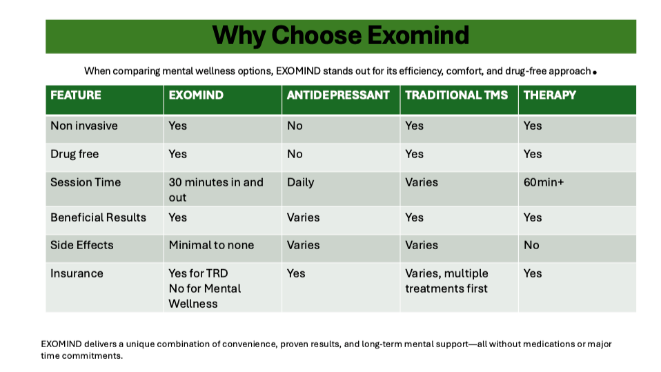 EXOMIND is an advanced, non-invasive treatment designed to help you take control of your mental and emotional well-being—without medication or surgery.